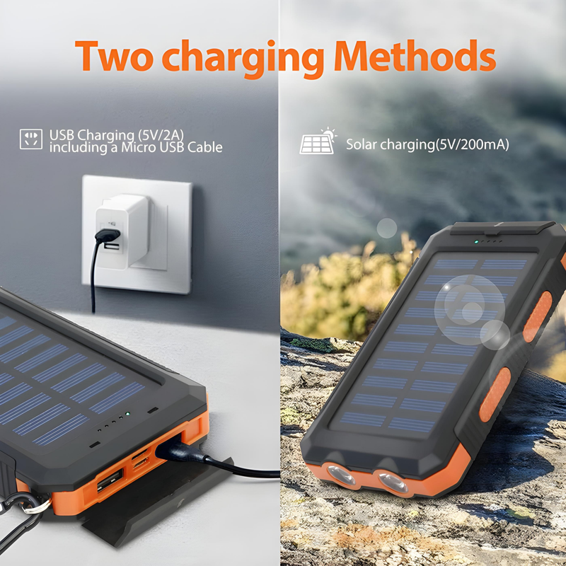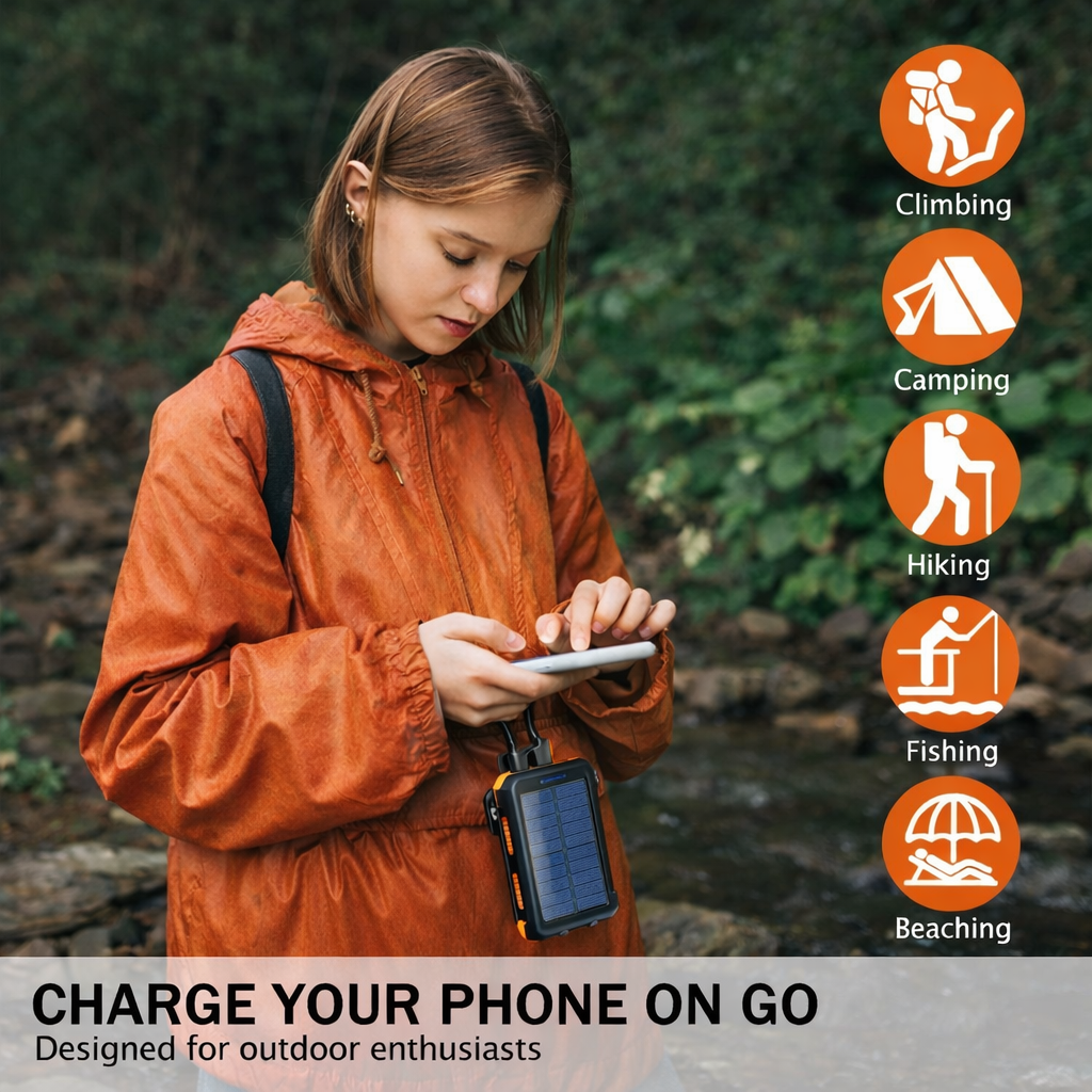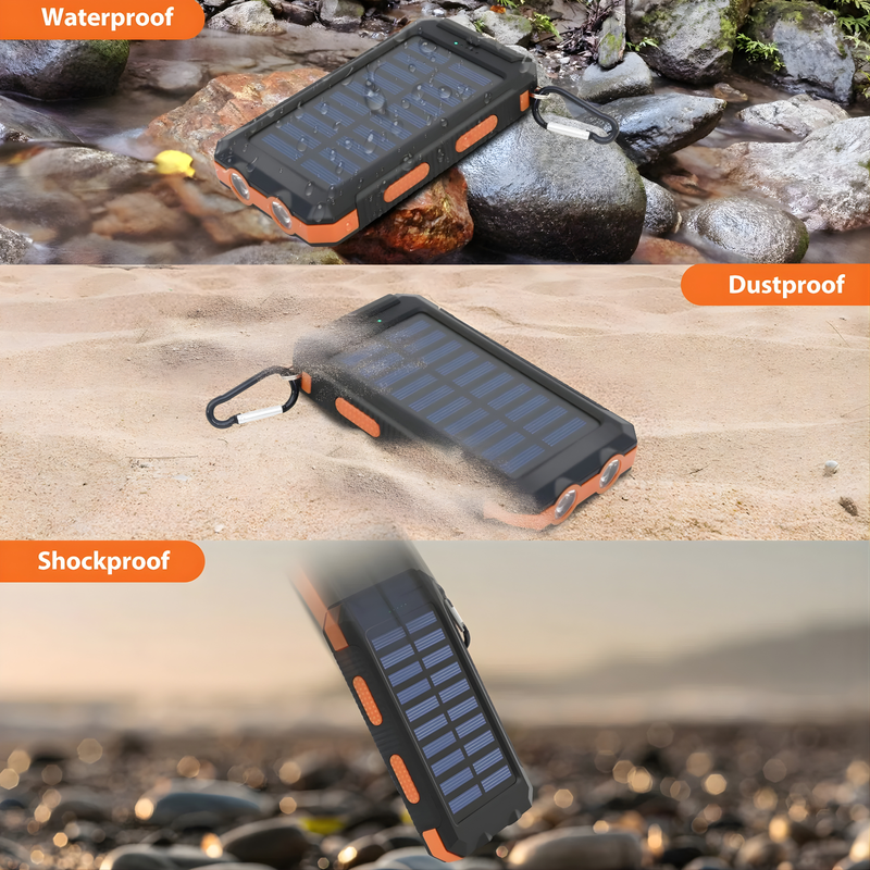 Stay connected no matter where you are. This powerful 20000mAh solar charger keeps your devices charged during hiking, camping, travel, or emergencies. Built tough, waterproof, and ready for any adventure. Never run out of battery again. ⚡